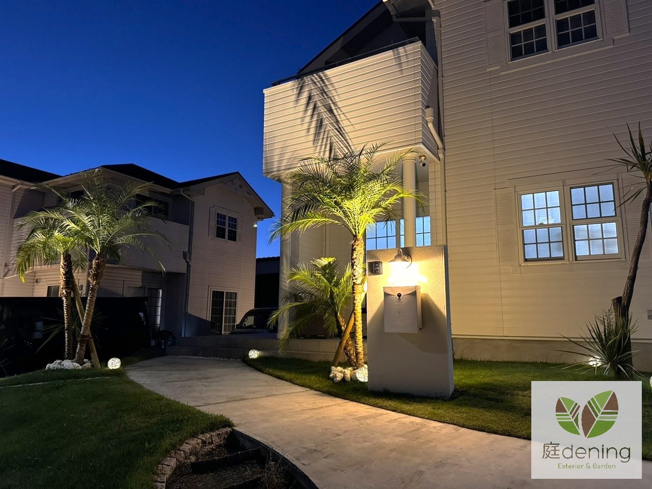 夜の照明は門柱とフェニックスを美しく演出しております。