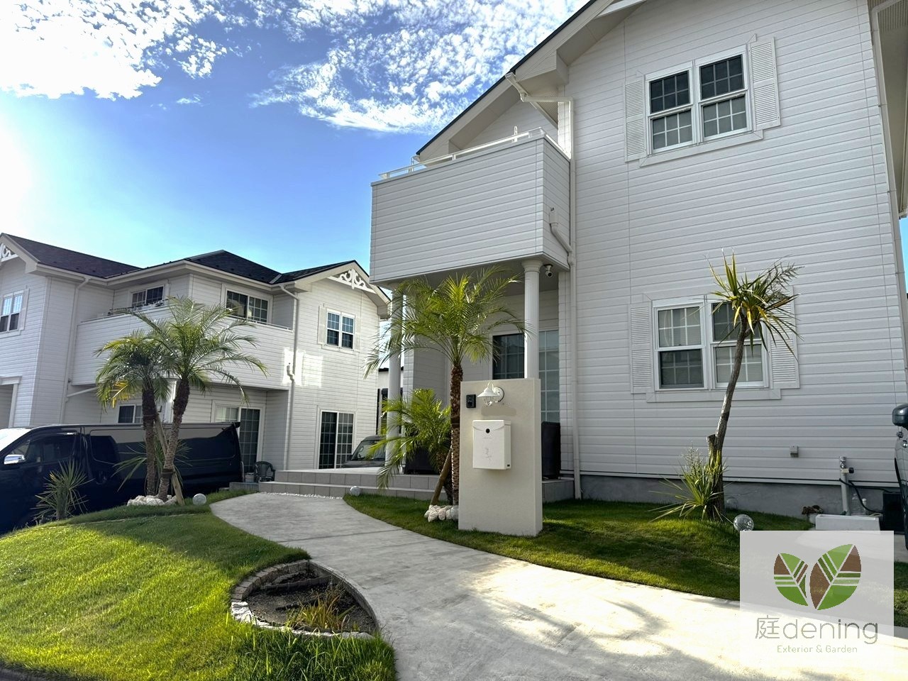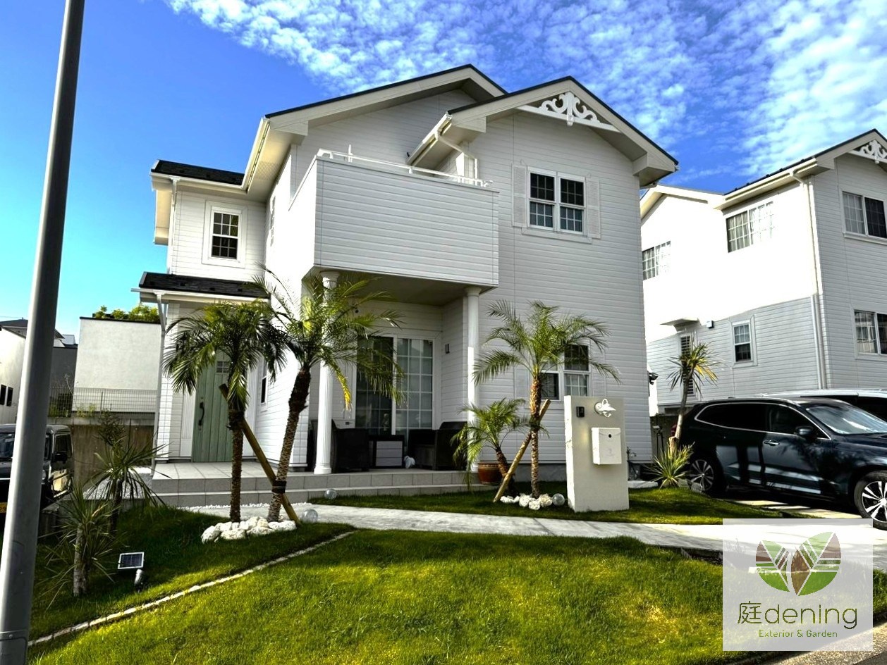 植木には潮風にも強いフェニックスをアプローチを挟むように植え、
